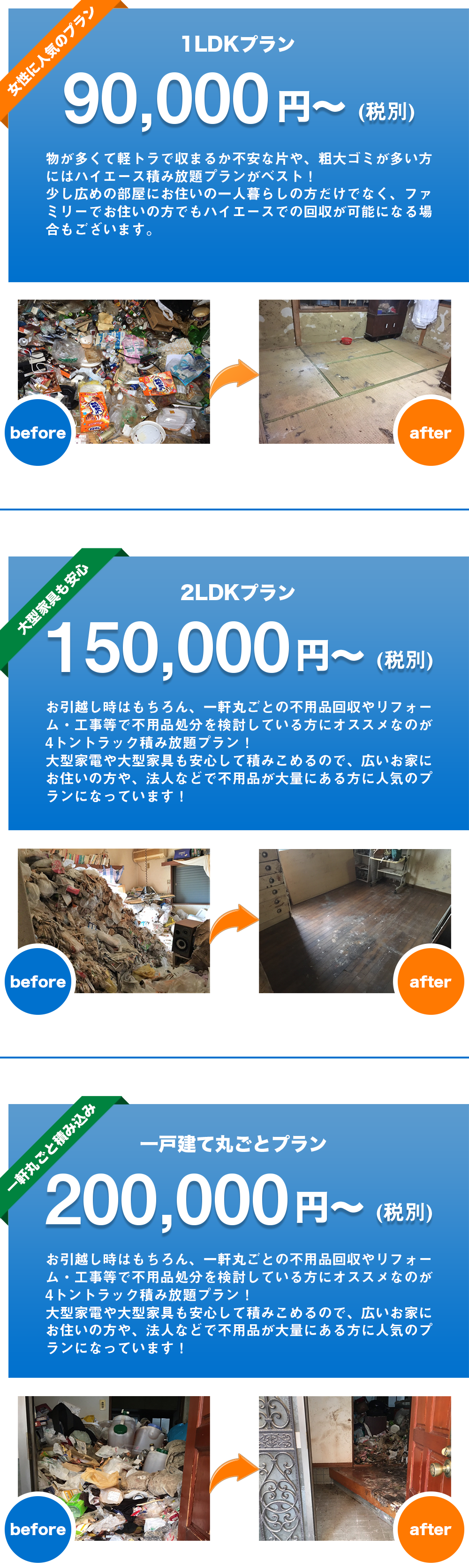 パワーズは、回収費・車両費・輸送費など、全てまとめたパック料金です。後から追加料金の請求はありません。即日対応も追加費用なしで対応可能!