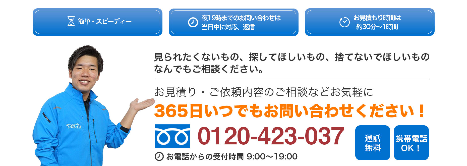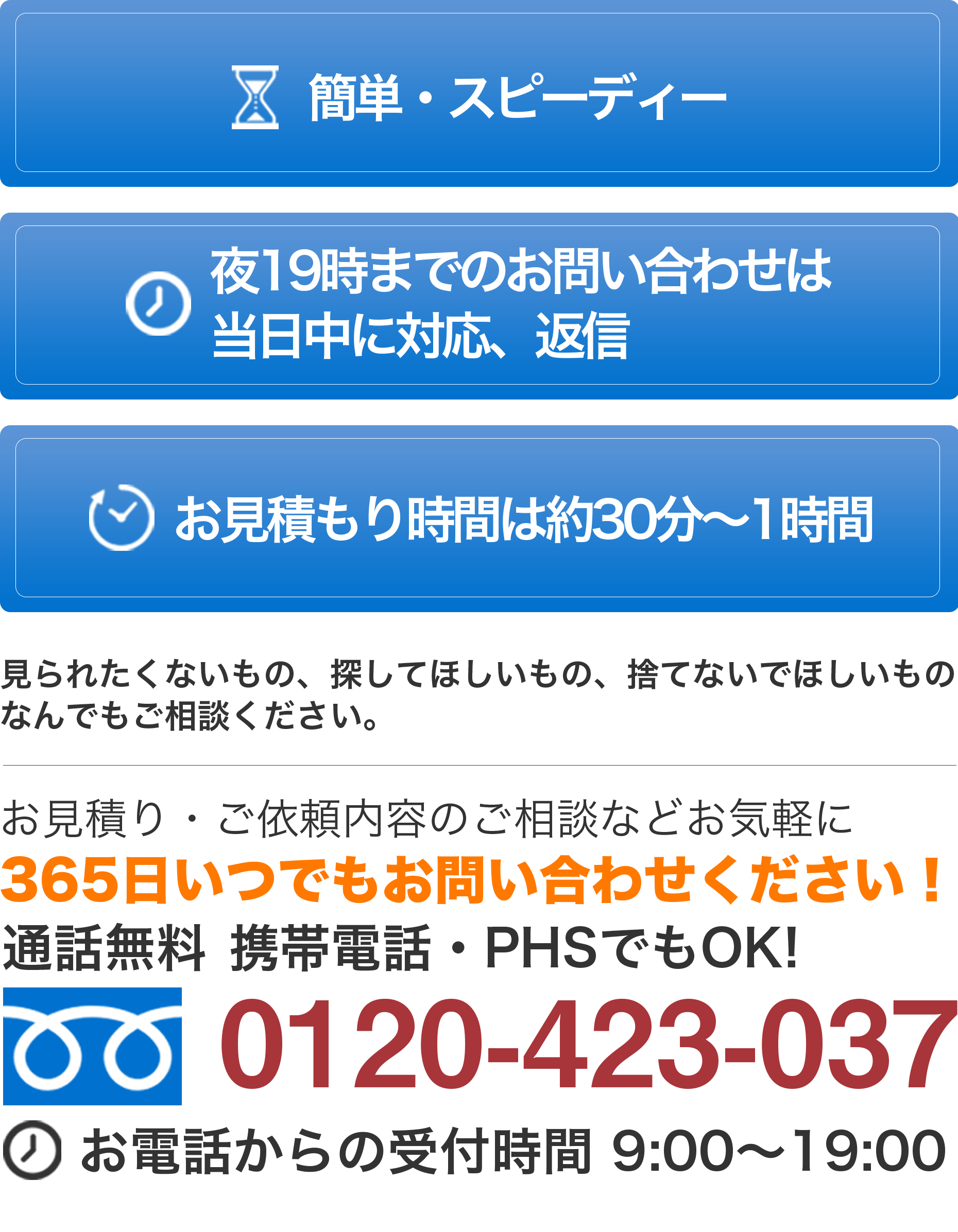 お電話かメールでご連絡をいただければ、いつでも駆けつけます。