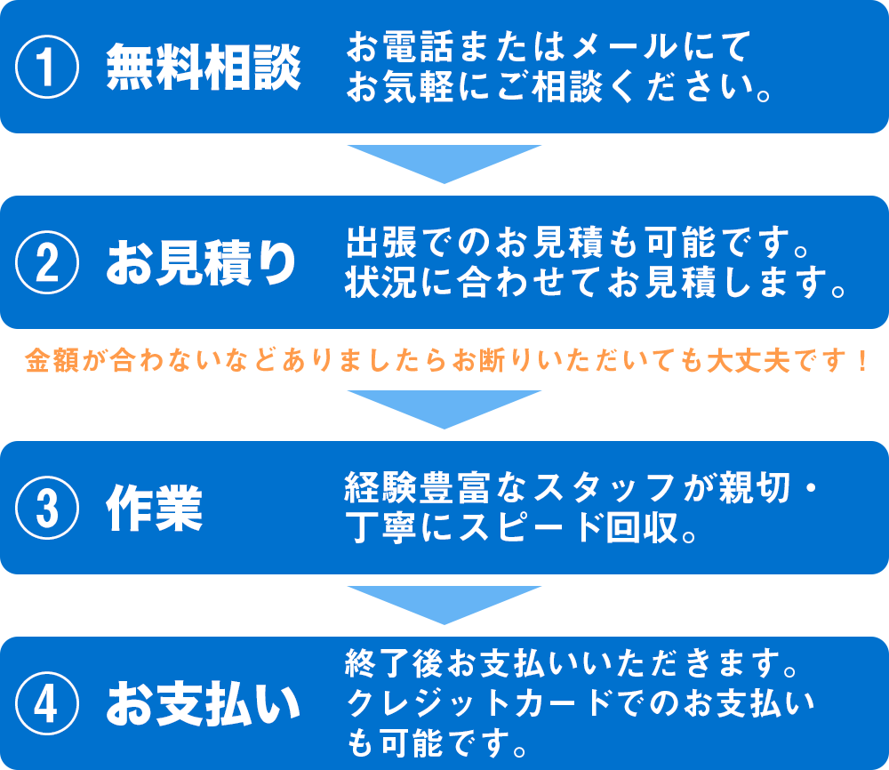 多くのお客様のご支援を通して身につけた、効率的な回収技術で皆様をサポートします。処分がしづらそうなものや、大量の不要品でもお気軽にご相談ください。